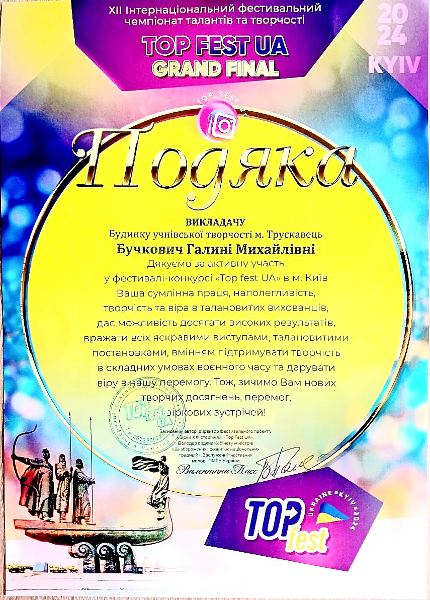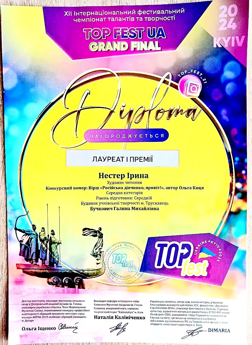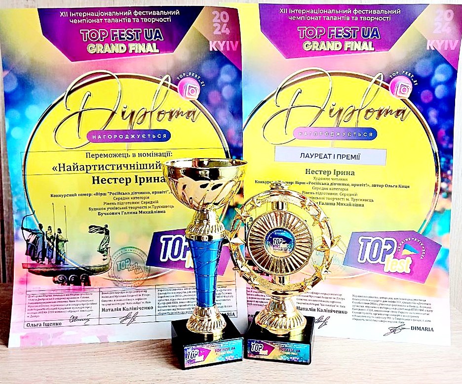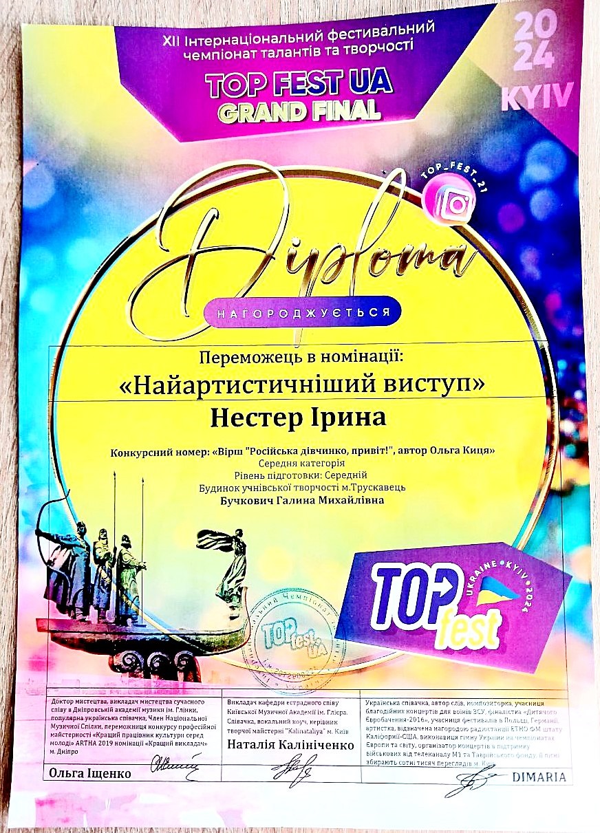 15 листопада у Києві відбувся суперфінал фестивалю TOP FEST UA Grand Final. TOP FEST UA – це новий формат фестивального руху, який пройшов у таких містах, як Дніпро, Львів, Трускавець, Буковель, Варна (Болгарія). До Києва у супер фінал TOP FEST UA були запрошені переможці, які пройшли відбірковий тур у вищезгаданих містах. Однією з них була юна трускавчанка Ірина Нестер – вихованка гуртка «Сценічна мова» (керівник Галина Бучкович) Будинку учнівської творчості м.Трускавець. У Києві Ірина Нестер яскравим виступом підтвердила свій високий рівень сценічної майстерності, за що отримала Диплом Лауреата I премії та кубок фіналіста, а також Диплом Переможця в номінації «Найартистичніший виступ» і кубок. Керівнику гуртка «Сценічна мова» Галині Бучкович вручили Подяку за сумлінну працю, наполегливість, творчість та віру у своїх талановитих вихованців. Вітаємо Ірину Нестер із блискучим виступом, нехай ця перемога стане початком нових творчих злетів і подарує безмежне натхнення до творчості!